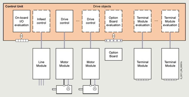 固件以对象的形式进行组织。驱动对象用于针对输入模块、电机模块、电源模块以及通过 DRIVE-CLiQ 连接的其他系统组件执行开环和闭环控制功能。