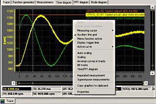 与驱动对象相关的输入和输出变量的时间特性可通过集成的轨迹功能进行测量,并通过 STARTER 调试工具进行显示。轨迹可同时记录最多 4 个信号。一个记录可通过自由选择边界条件来触发,例如,通过一个输入或输出变量的值来触发。