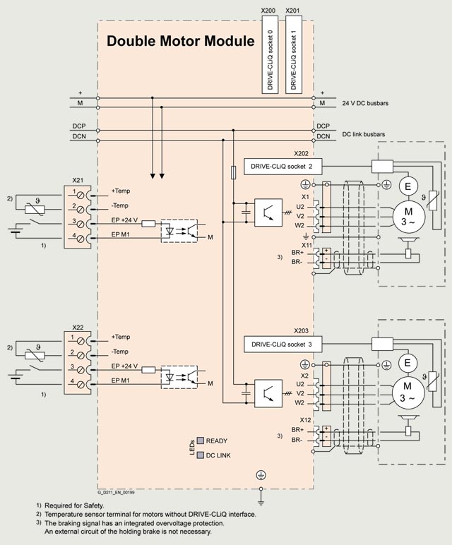 SINAMICS S120 双电机模块 输入:600V DC 输出:400V 三相交流,1.7A/1.7A 紧凑书本型 内部风冷 优化的脉冲图形和 支持优质 安全功能 包括 DRIVE-CLiQ 电缆