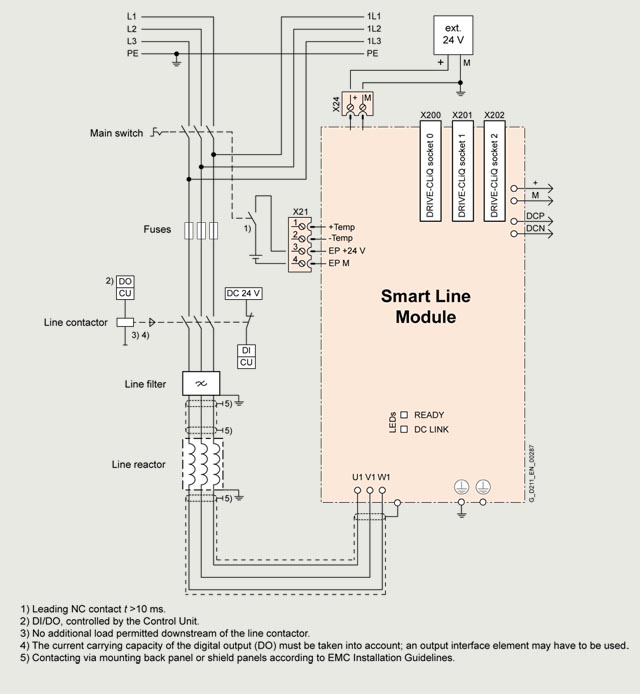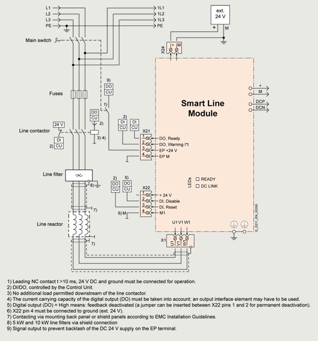 非调节型电源模块为非可调馈电/反馈单元(用于输入电源的二极管桥;通过 IGBT 实现稳定的再生换相整流),具有 100% 的再生反馈功率。通过一个数字量输入点(智能电源模块5 kW和10 kW)或通过参数设定(智能电源模块16 kW,36 kW 和 55kW)可关闭该模块的再生反馈能力。回馈整流装置专为连接接地 TN/TT 系统和非接地 IT 系统而设计。