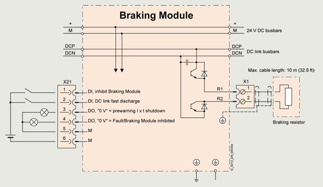 在电源发生故障时(例如,紧急缩回或 1 类紧急关闭),将驱动器切换为受控制停止状态或,例如,在取消电源模块的再生反馈能力时,限制发动机短期操作的直流链路电压,这两种情况下需要制动模块和匹配的外部制动电阻器。 制动模块含有功率电子器件及其相应的控制电路。 工作期间,直流链路的电能在一个外部制动电阻上转变为热损耗。 制动模块自主工作。 可以有多个制动模块同时运行。 在此情况下,每个制动模块都必须有其自己的制动电阻。